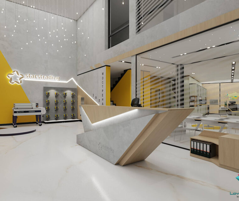 - Furniture/Elements: Custom office furniture, branded color and graphic motifs